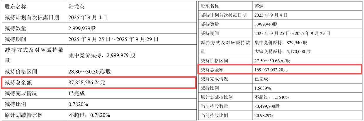 9月25日至9月29日,公司控股股东蒋渊及其一致行动人陆龙英合计减持899.99万股,减持比例为2.35%,减持总金额近2.6亿元。资料显示,陆龙英为蒋渊的母亲,两人为母女关系。