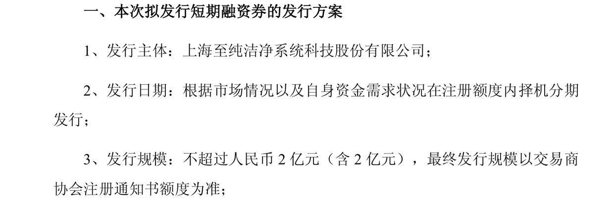 10月15日晚间,至纯科技(603690)发布公告称,为进一步拓宽公司融资渠道,确保业务发展获得坚实的资金保障,公司拟向中国银行间市场交易商协会申请注册发行不超过2亿元(含2亿元)的短期融资券,期限不超过12个月。