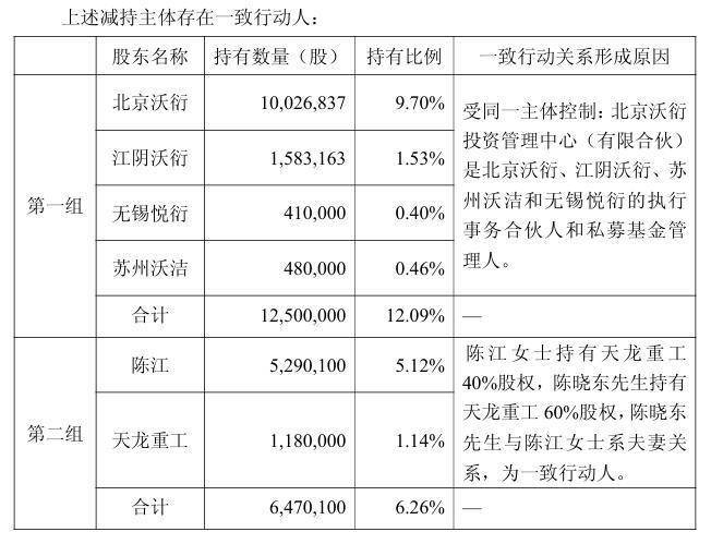 天龙重工和陈江为一致行动人,合计持有公司6,470,100股, 占公司股份总额的6.26%。陈江女士持有天龙重工40%股权,陈晓东先生持有天龙重工60%股权,陈晓东先生与陈江女士系夫妻关系,为一致行动人。