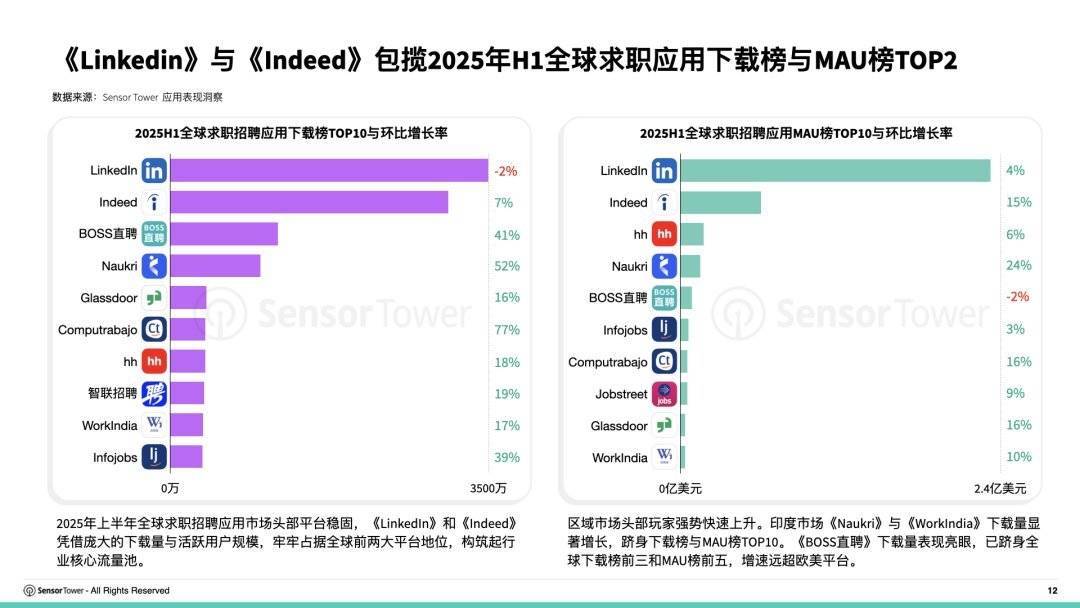 《Linkedin》与《Indeed》包揽2025年H1全球求职应用下载榜与MAU榜TOP2