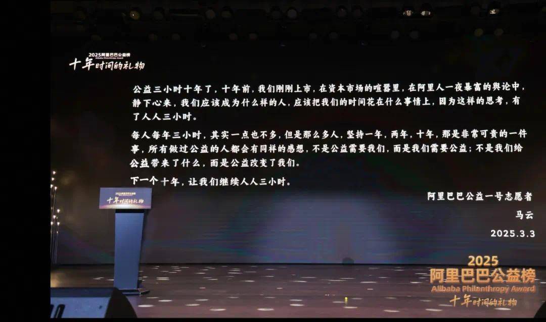 据了解,“910”是阿里巴巴26岁的生日,也是“人人3小时”十周年的日子。十年前的这一天,马云给全体阿里人写了一封信:公司员工每人每年拿出3小时做公益。